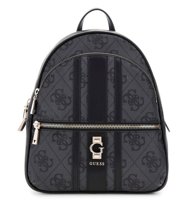 Velký batoh má jedno ucho do ruky a nastavitelné popruhy na záda. Na přední straně je menší kapsa na zip a větší kapsa na zip. Batoh má zapínání na zip. Uvnitř je kapsa na zip a dvě otevřené kapsičky. Kovové komponenty mají zlatou barvu. U kabelky je ochranný pytlík s logem Guess.