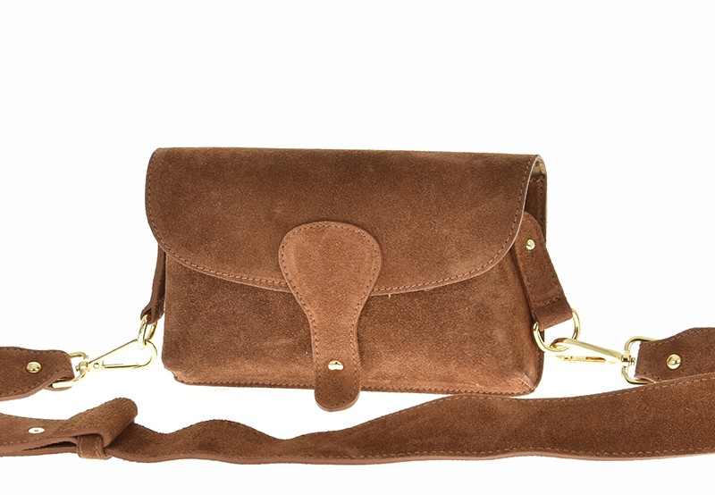 Kožená kabelka je vyrobena z kvalitní italské kůže. Kabelka má pevný tvar. Kabelka má dlouhý, široký, nastavitelný a odnímatelný popruh, takže ji lze nosit v ruce jako psaníčko nebo šikmo přes rameno jako crossbody. Kabelka má klopnu se zapínáním na magnet. Pod klopnou je zapínání na zip. Kovové komponenty mají zlatou barvu.