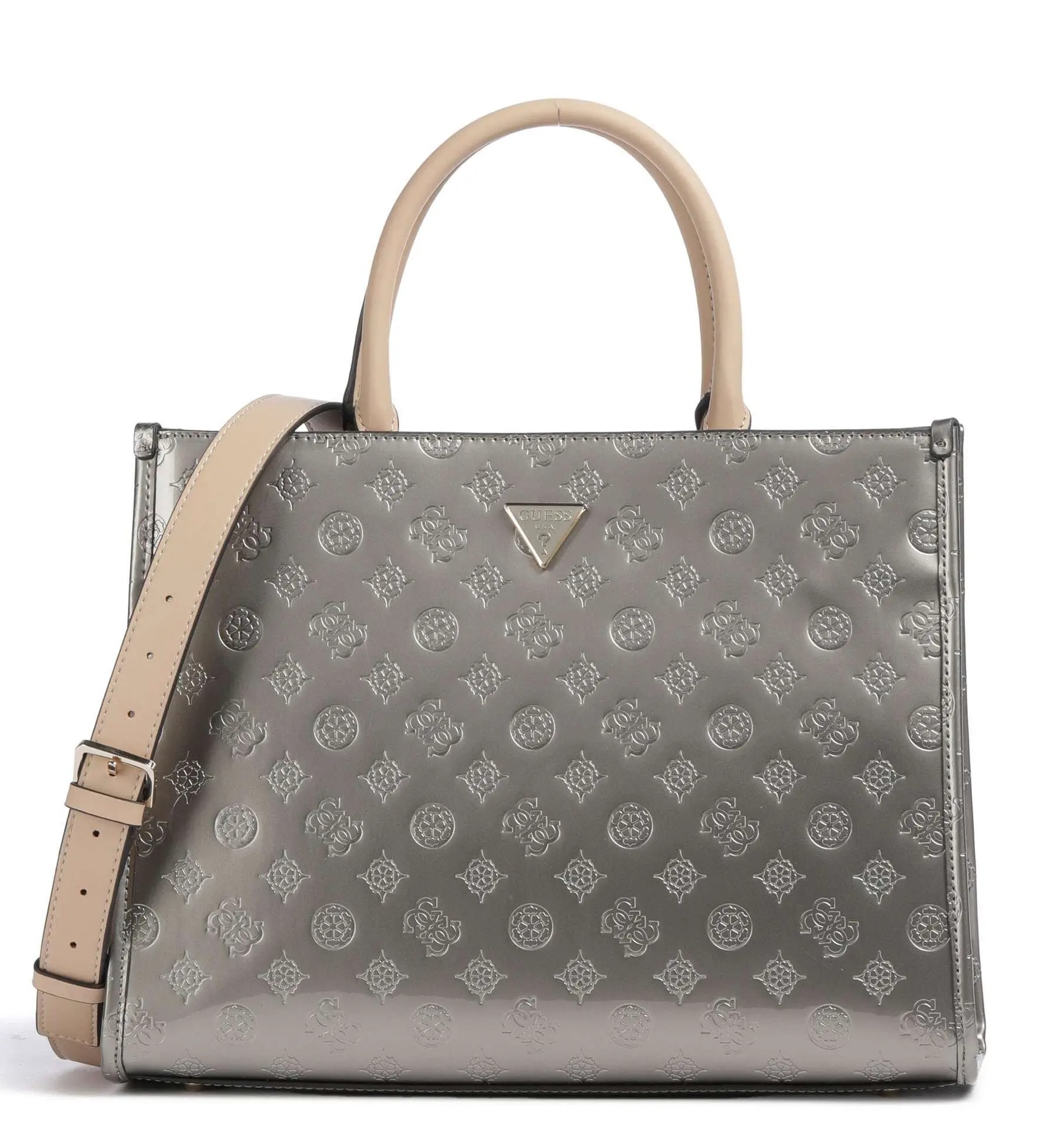 Nádherná kabelka má dvě ucha do ruky a přídavný, nastavitelný a odnímatelný popruh přes rameno. Na zadní straně je kapsa na zip. Kabelka má tři komory. Přední a zadní komora mají zapínání na magnet, prostřední komora má zapínání na zip. Uvnitř kabelky je kapsa na zip a dvě otevřené kapsičky. Kovové komponenty mají zlatou barvu. U kabelky je ochranný pytlík s logem Guess.