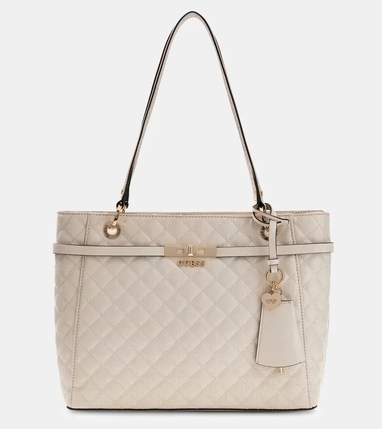 Kabelka má dvě ucha do ruky, ale vejde se i na rameno. Kabelka má zapínání na zip. Vnitřní prostor kabelky je rozdělený přepážkou na dvě části. Uvnitř je pevná podšívka s logem Guess, kapsa na zip a dvě otevřené kapsy. Za hlavní komorou je ještě další velká otevřená kapsa. Kovové komponenty mají světle zlatou barvu. U kabelky je ozdobný přívěšek. Ke kabelce je ochranný textilní pytlík s logem Guess.