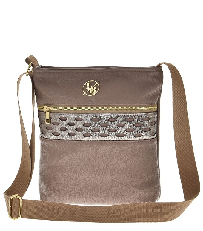 Kabelka má dlouhý, nastavitelný popruh a lze ji tak nosit šikmo přes rameno jako crossbody. Na přední i zadní straně jsou kapsy na zip. Kabelka má zapínání na zip. Uvnitř je červená podšívka, dvě kapsy na zip a otevřená kapsa. Kovové komponenty mají zlatou barvu.