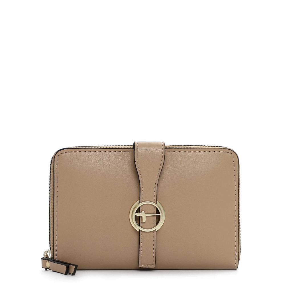 Středně velká peněženka má zip ze tří stran. Uvnitř jsou 4 přihrádky na bankovky, zipová kapsička na mince, 6 záložek na doklady a 6 záložek na karty. Kovové komponenty mají stříbrnou barvu. Na přední straně je logo Tamaris.